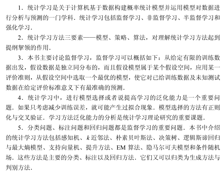 - 统计学习的前提:同类数据具有一定的统计规律性,这里的同类数据是指具有某种共同性质的数据