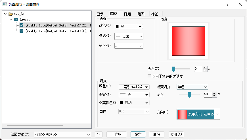 点击柱体,在绘画属性中,选择渐变填充,单色,方向选择水平方向,从中心到两边
