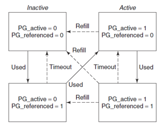 - 使用增强的LRU算法,每页维护两个标志:活动/非活动和引用或未引用。
