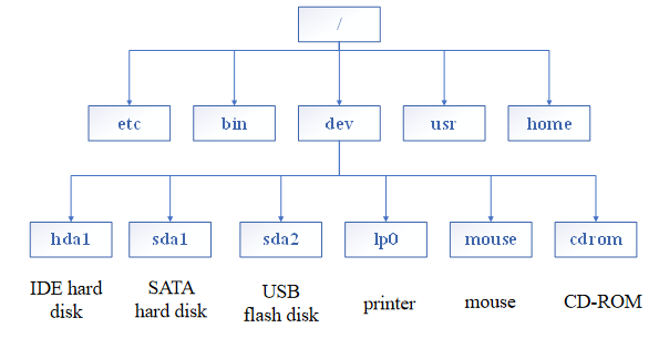 - 根目录名为/(斜杠),并且/字符也用于分隔目录名。