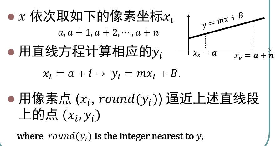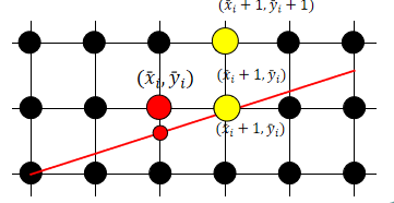 - 选择离直线较近的那个像素点,即离\((x_{i+1}, y_{i+1})\)较近的点