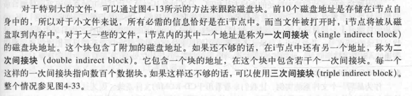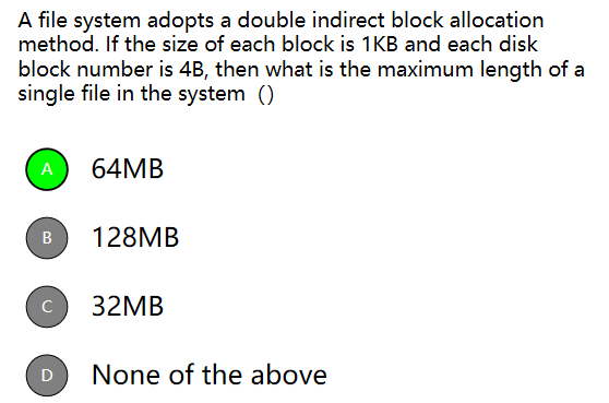 - 使用的是二级间接索引,所以文件最大大小为:\(2^8\cdot2^8\cdot1KB \ =2^6MB = 64 MB\)