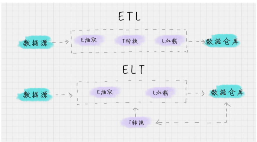 - ELT 和 ETL 相比,最大的区别是“重抽取和加载,轻转换”,从而可以用更轻量的方案搭建起一个数据集成平台
