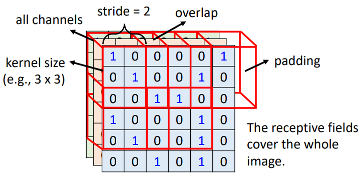- kernel size(感受野或者叫卷积核的大小):\(n \times n\),一般为\(3\times3\)
