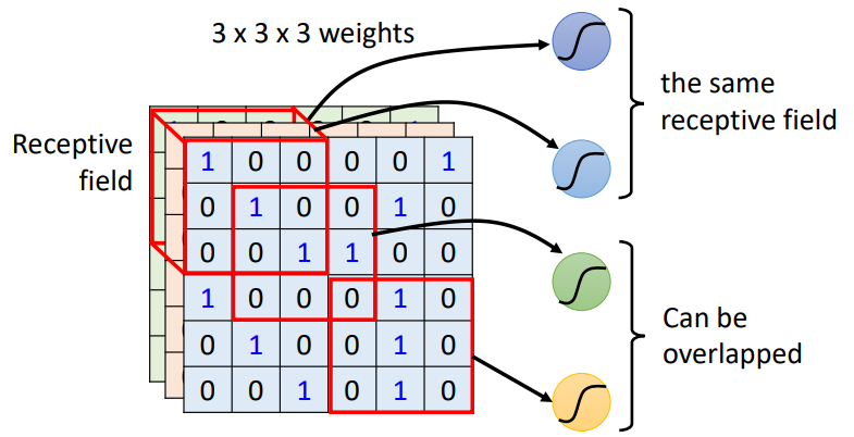 - 常规设置:每一个感受野有一组神经元(例如64个神经元)