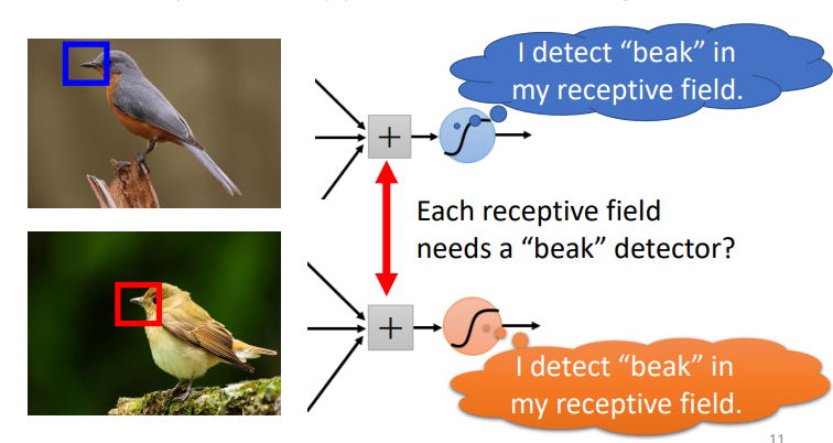 给我们两张鸟的图片,它们都有鸟喙,但是它们的鸟喙在图片上的不同区域上,那对于每一个感受野来说,都需要配置一个专门的鸟喙检测的神经元吗?