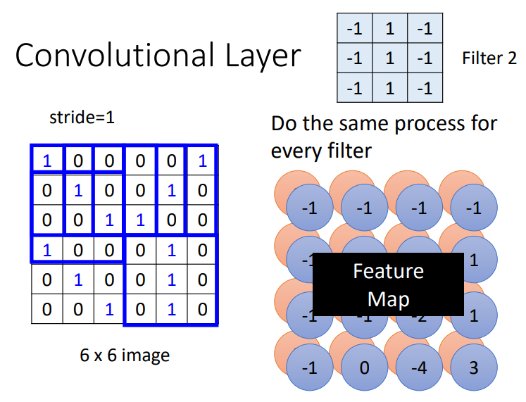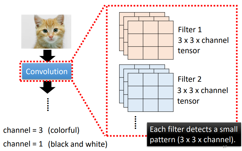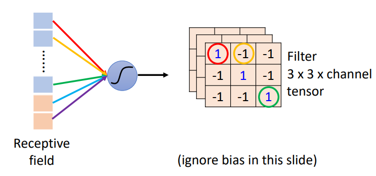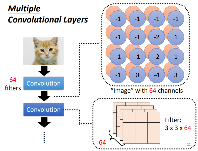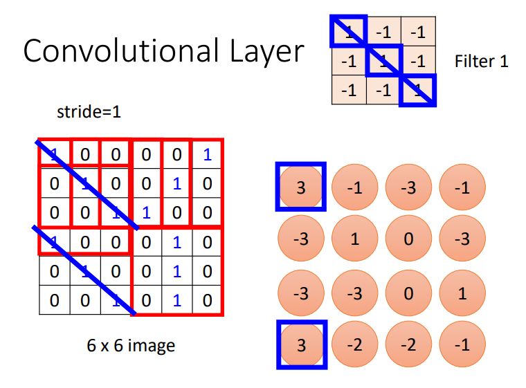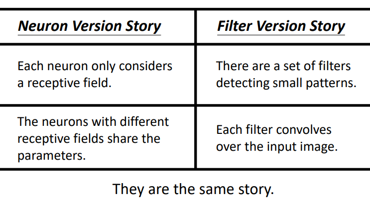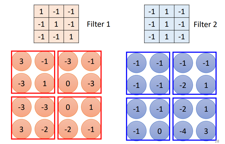 - 每个滤波器会在整张输入图片上进行卷积操作