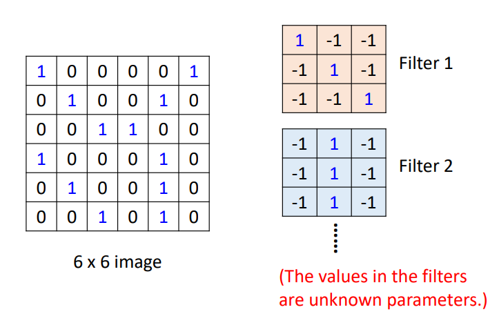 假设我们的通道为1,现在我们拥有一张6*6图片,在给定的filter中,它们的值是不确定的,需要训练得到