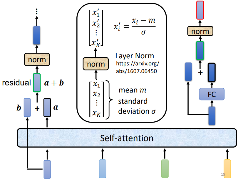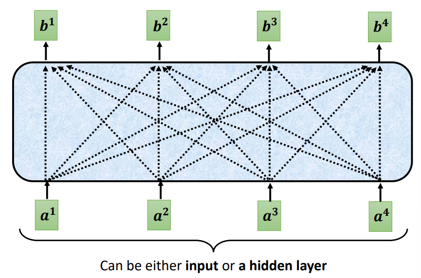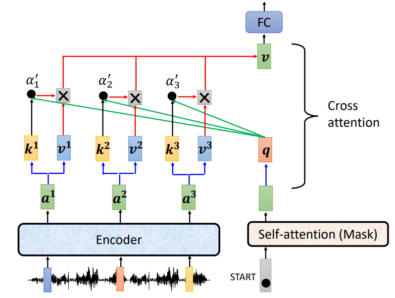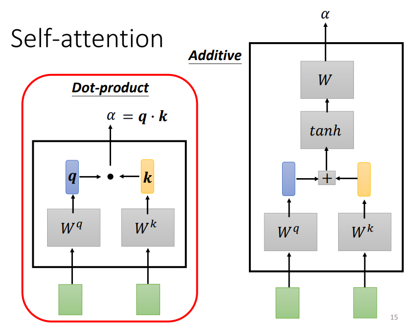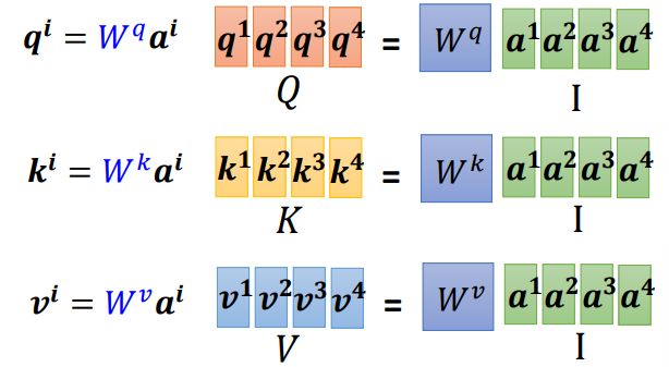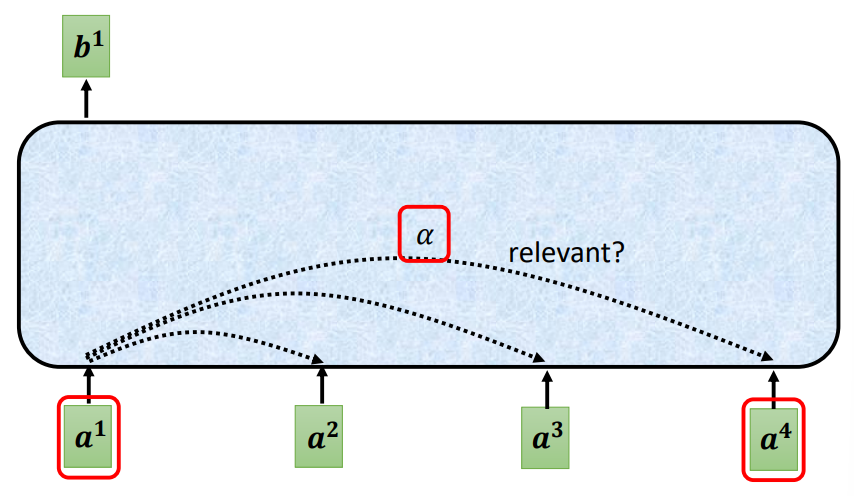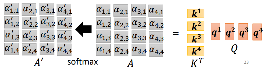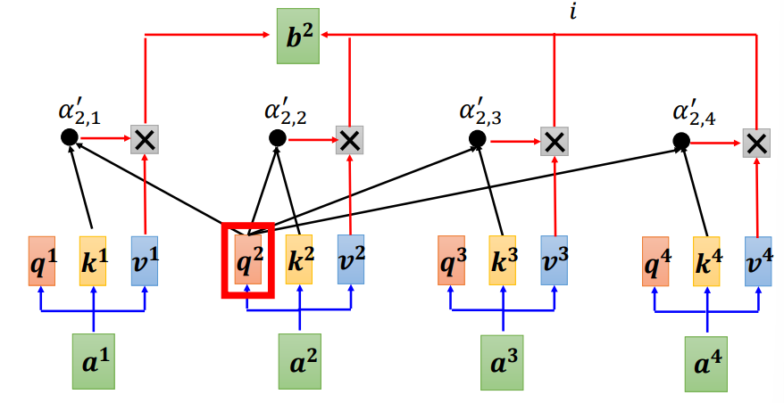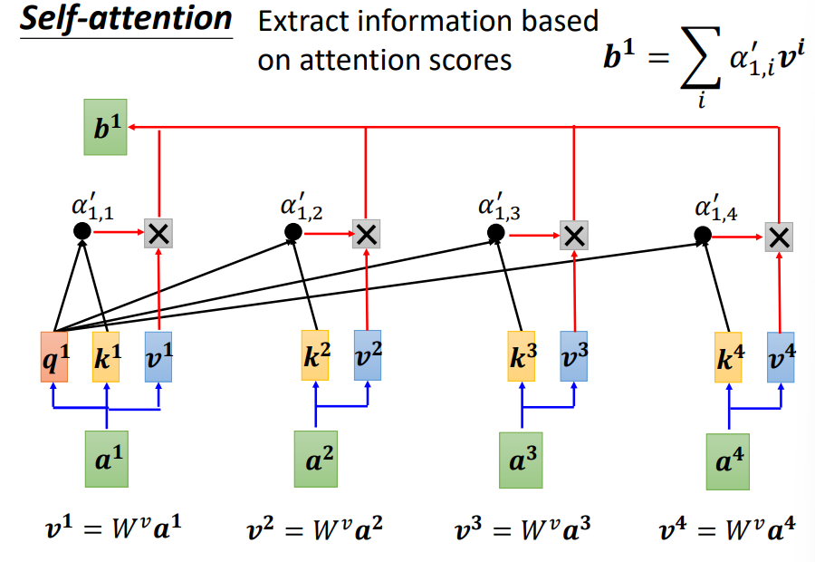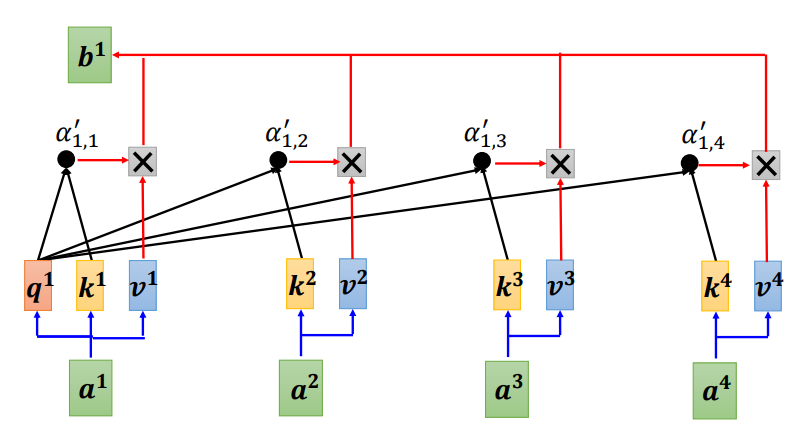 我们利用当前向量的\(q\)矩阵,来与自身和其他向量的\(k\)矩阵进行运算,再经过\(softmax\)运算,得到\(\alpha^{\prime}\),即 \[ \alpha^{\prime}_{1,i} = \sum_{i=1}^{N}\frac{exp(q^1\cdot k^i)}{\sum^N_{j=1}exp(q^1\cdot k^j)} \] 这里以\(a^1\)向量(\(q^1\)矩阵)为当前向量。