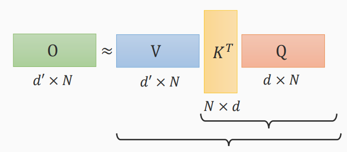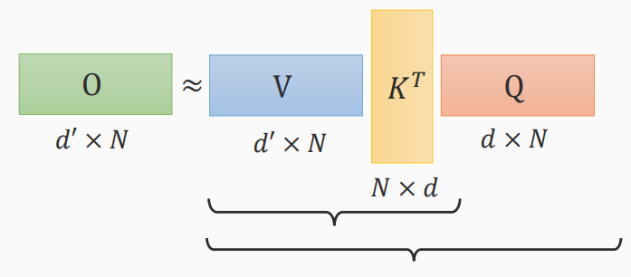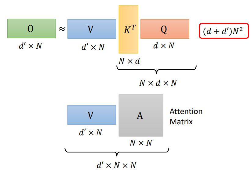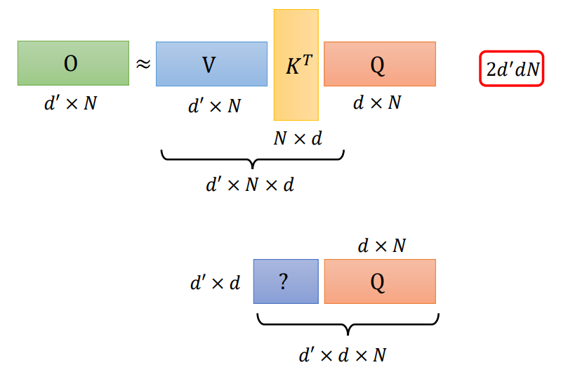 先计算\(V K^T\)的话,会计算\(2d^\prime dN\)次乘法运算,小于正常运算次数,序列长度N是大于维度d的