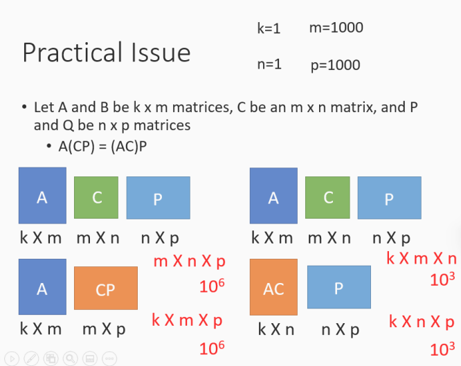 三个矩阵计算顺序不同,进行乘法次数不同,结果相同