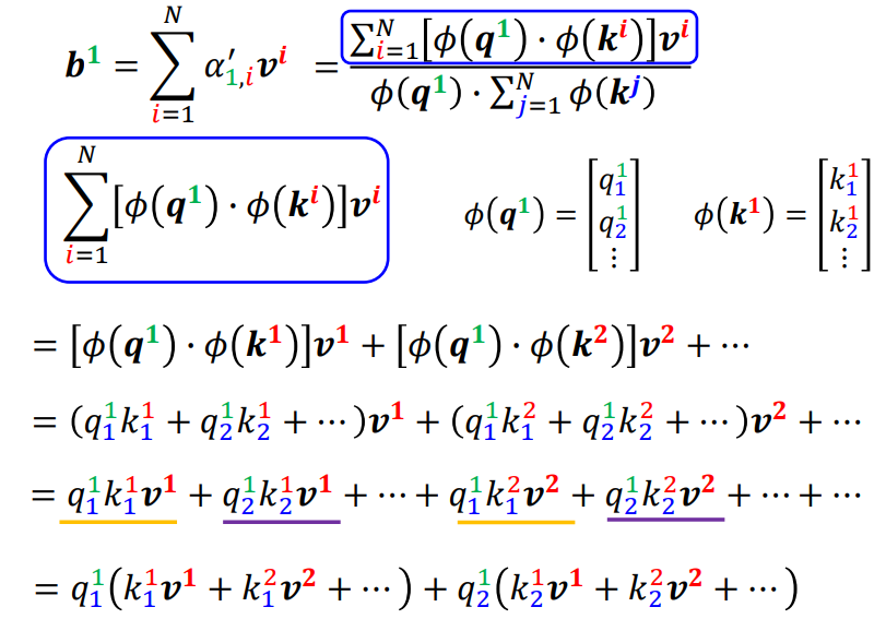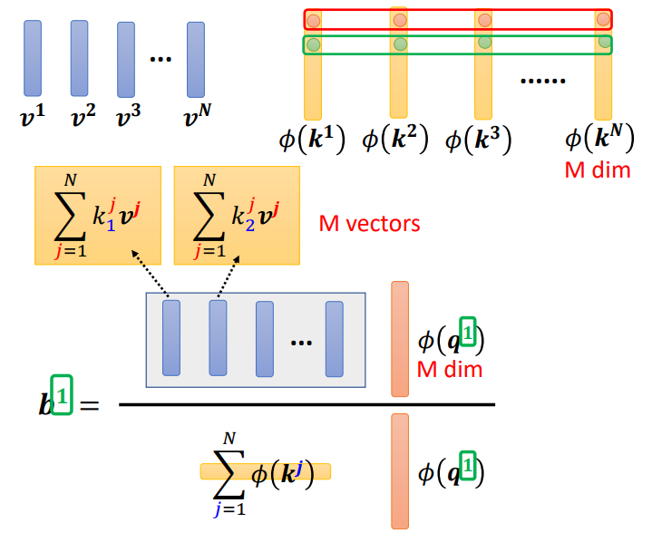 \sum^N_{i=1}\frac{\phi(q^1)\cdot\phi(k^i)}{\sum^N_{j=1}\phi(q^1)\cdot\phi(k^j)}v^i