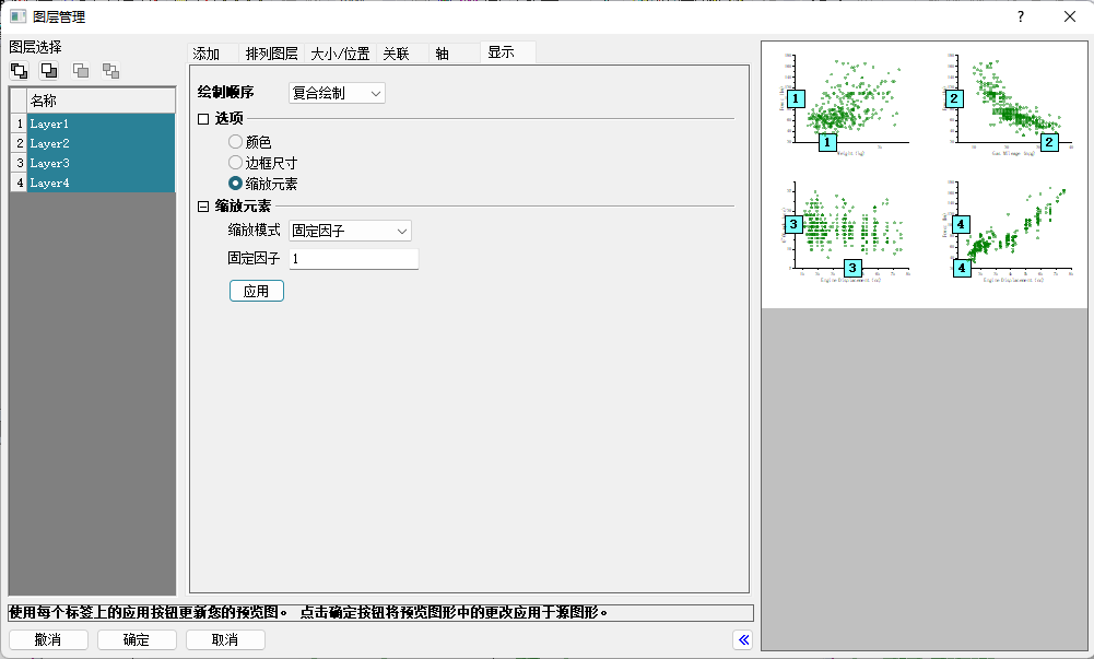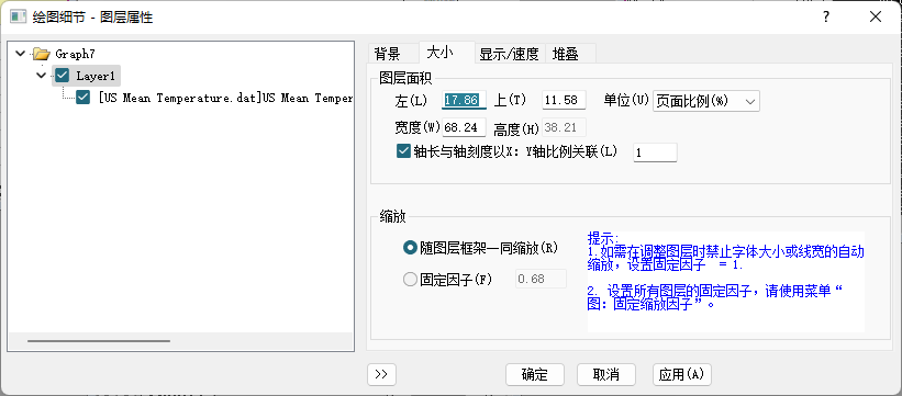 默认情况下,如果拖动图形层并调整其大小,或者在合并时调整了该层的大小,则文字字体和其他图形对象将重新调整大小。将“缩放模式”设置为“固定因子”可以防止在调整图层大小时缩放字体大小/线条厚度。(此行为也可以在“打印详细信息”对话框(图层级别)的“大小”选项卡中进行控制。)