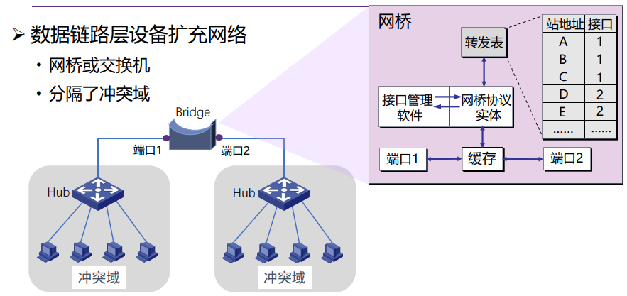 - 网桥维护一个目的地址表和相应的输出行,如下所示: