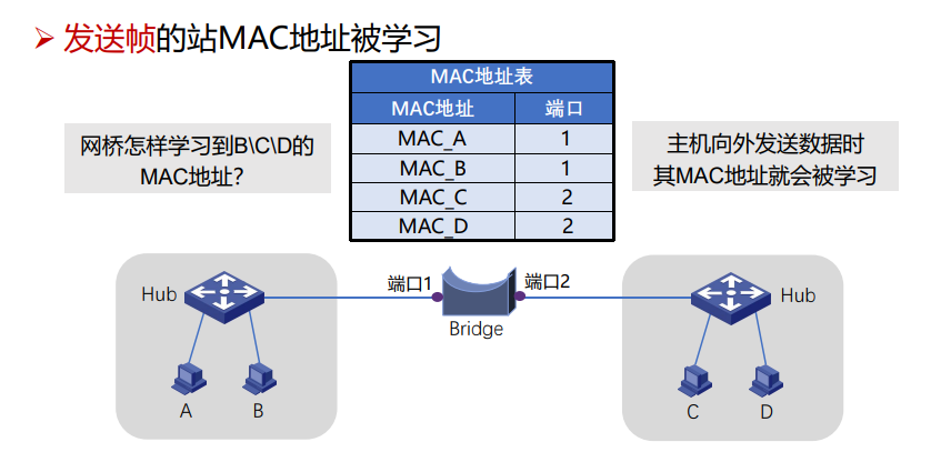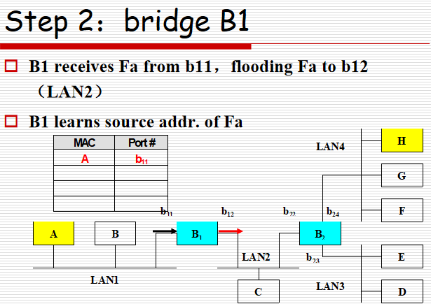 - 未知目的地的每个传入帧都在网桥连接到的所有 LAN 上输出,除了它到达的那个。