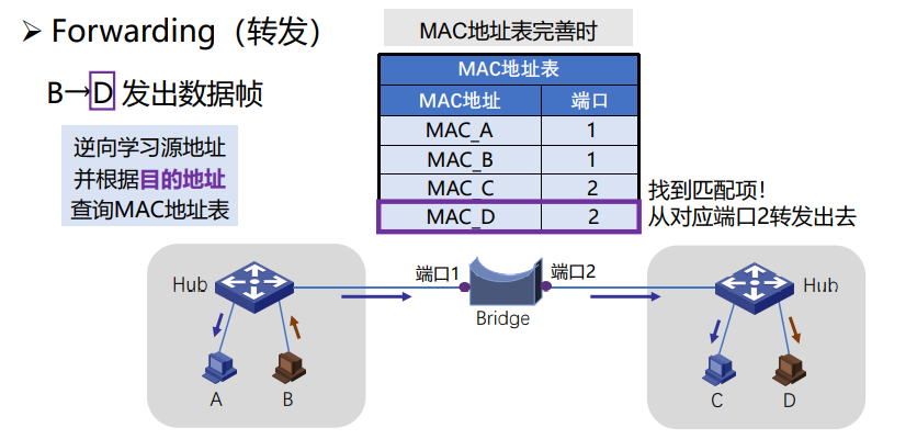 - 通过在网桥内的大(散列)表中查找目标地址来做出决定。