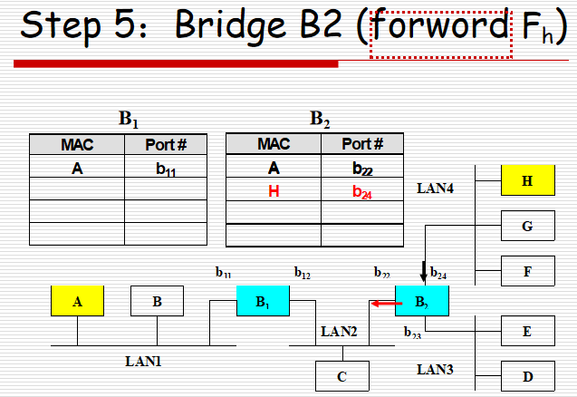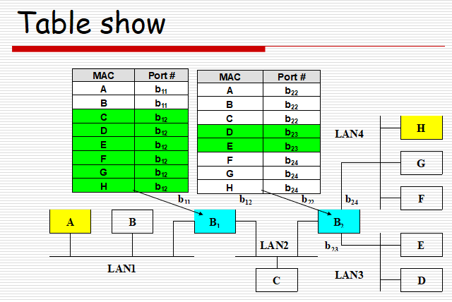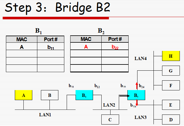 - 通过查看传入帧的源地址,网桥能够知道哪个机器可以在哪个 LAN 上访问,因此它在其哈希表中创建一个条目,将源机器与传入 LAN 链接起来。