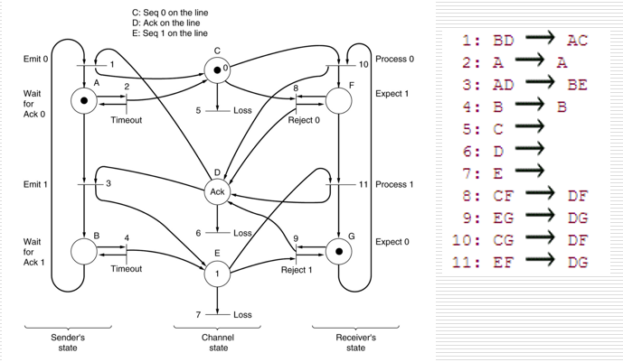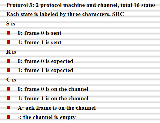 - 整个系统的状态是两个协议机和通道的所有状态的组合。