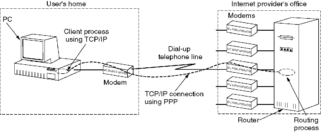 - PC 通过调制解调器呼叫提供商的路由器。