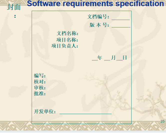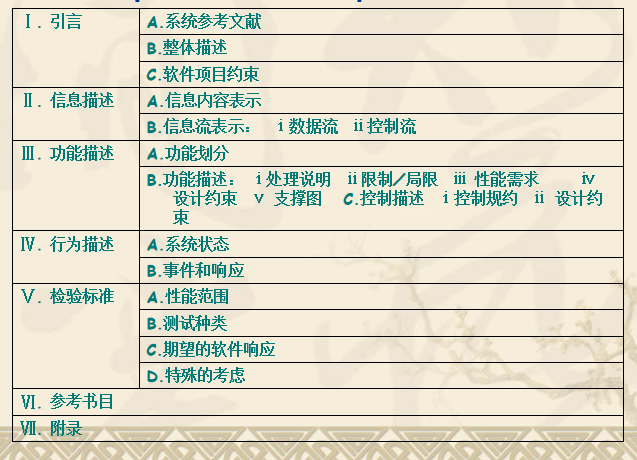- 以自然语言和图表表示的语句,说明系统预期提供的服务以及它必须在哪些约束条件下运行