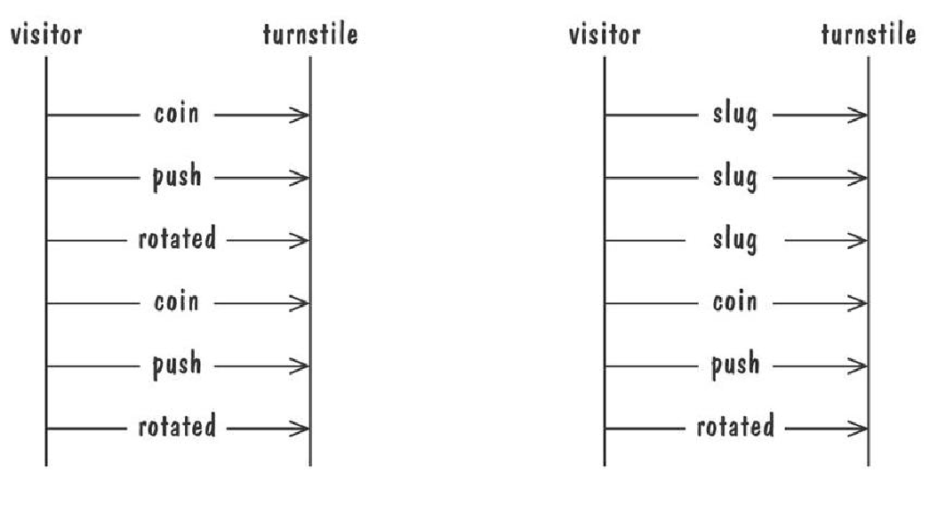 - Waiter takes order from customer 1; takes order from customer 2; serves customer 2; serves customer 1.