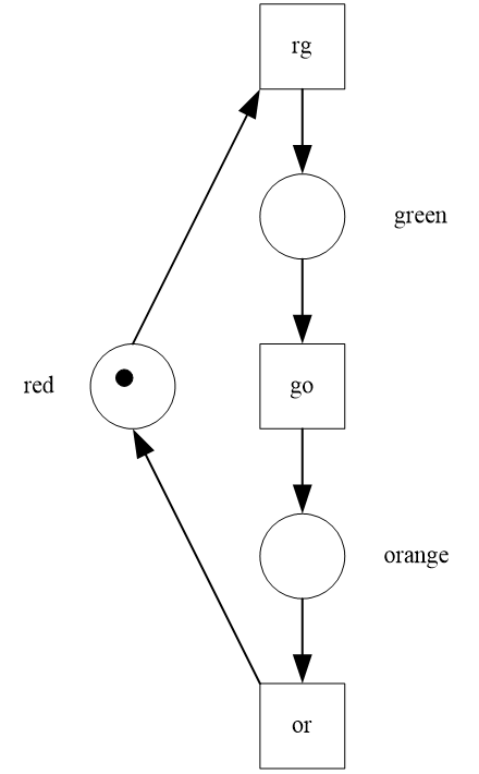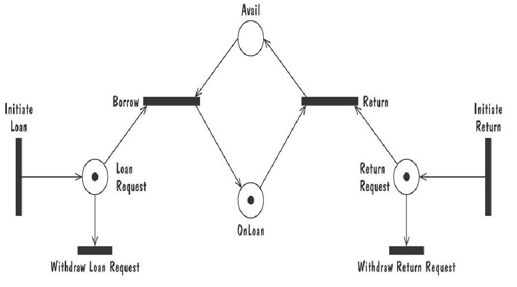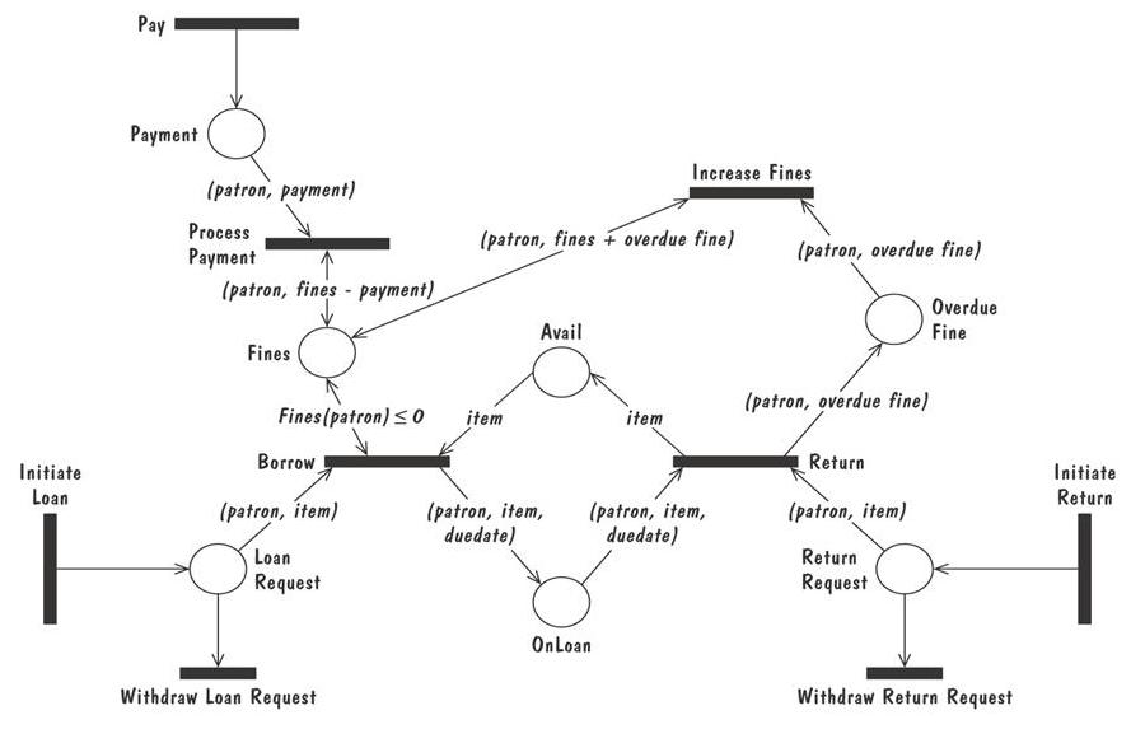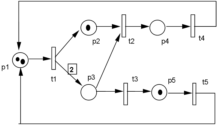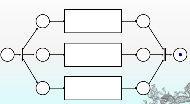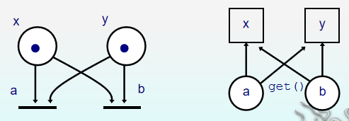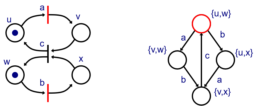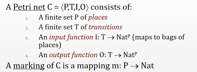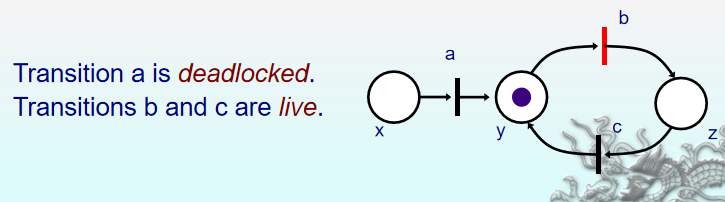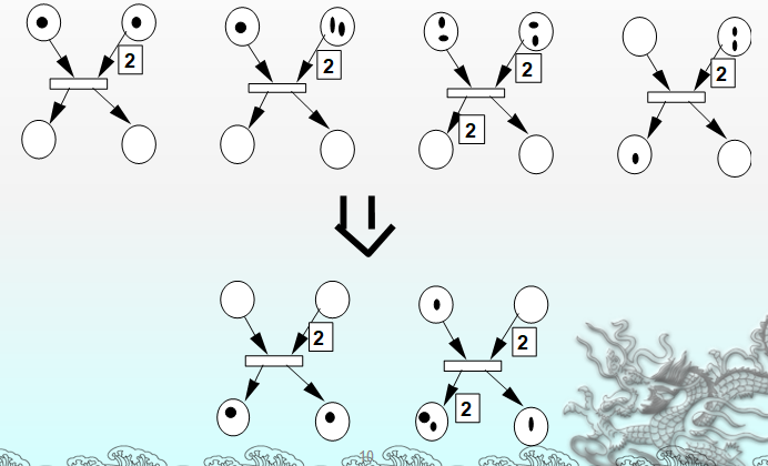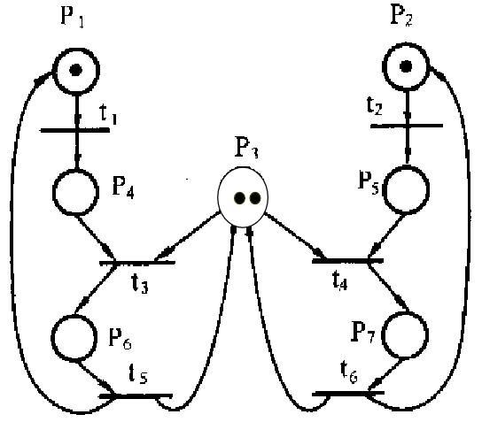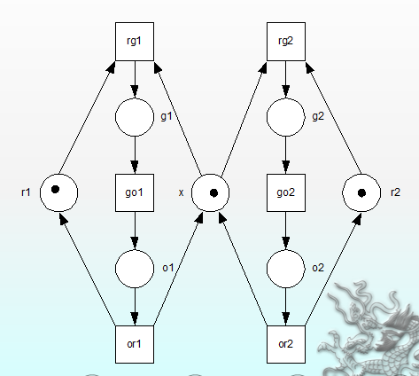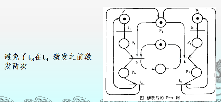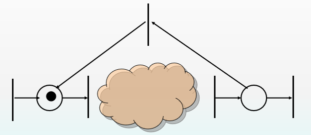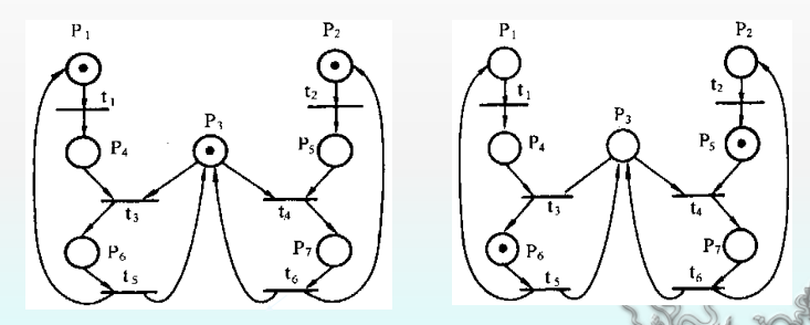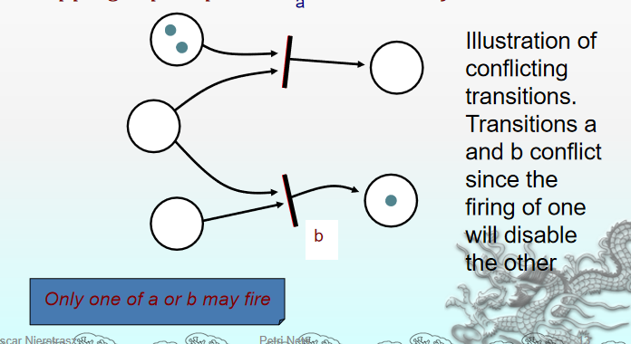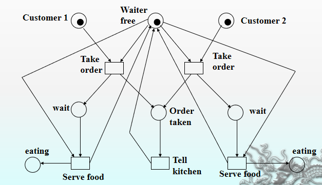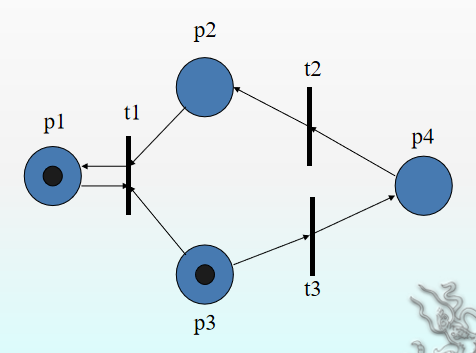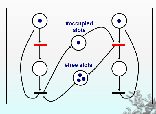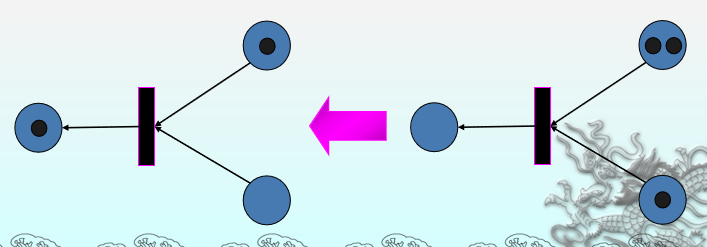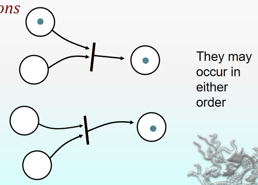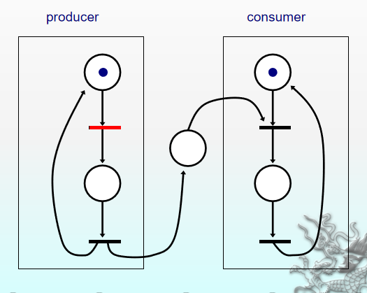 - Transitions 是进程,places 是共享资源,transitions 竞争获取令牌。