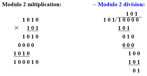 - 多项式运算是模2(modulo 2)完成的。加法和减法都与异或相同(等同于异或) EXCLUSIVE OR
