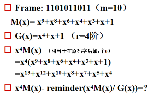 - 发送方和接收方提前就在生成多项式(generator polynomial)上达成一致, G(x)。