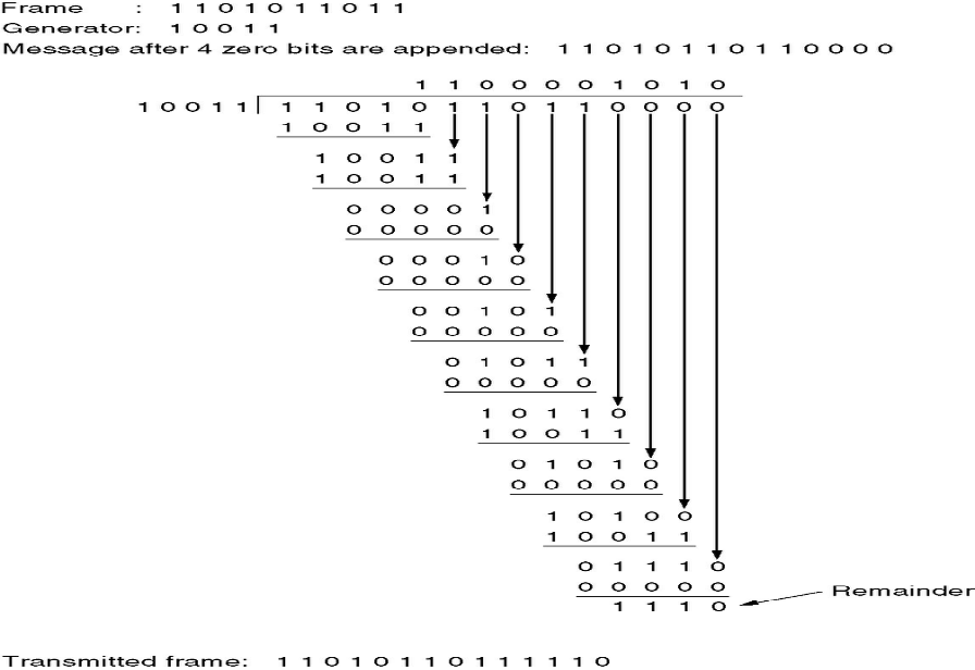 - 发送方在帧的末尾追加校验和(checksum),校验和帧表示的多项式可以被G(x)整除。