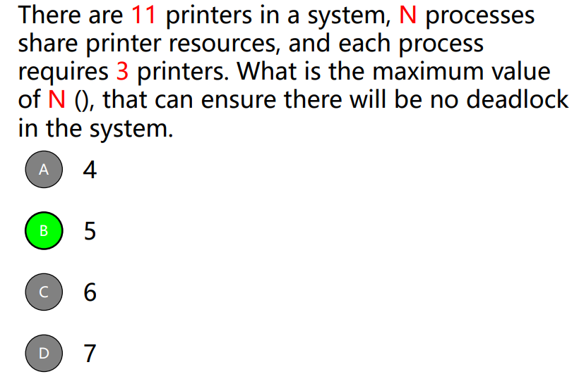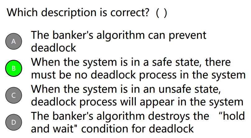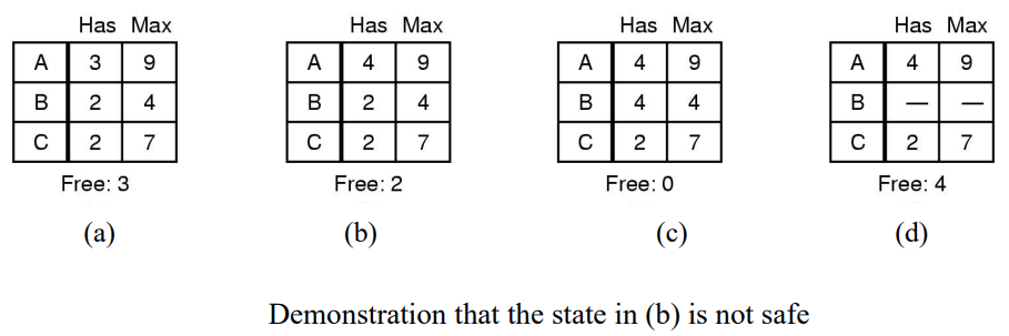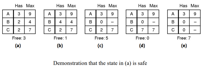 - 如果存在某种调度顺序,即使所有进程突然请求最大数量的资源,每个进程都可以运行完成,(没有死锁发生),则状态是安全的