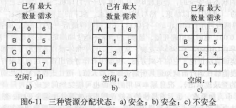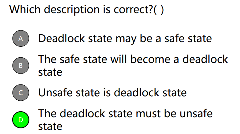 - 不安全状态可能是资源数不够满足所有进程造成的,不一定是死锁这种状态