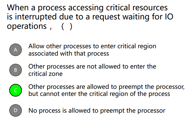- CPU只有发生时钟中断或其他中断后才会进行进程切换,屏蔽中断后,CPU将不会被切换到其他进程