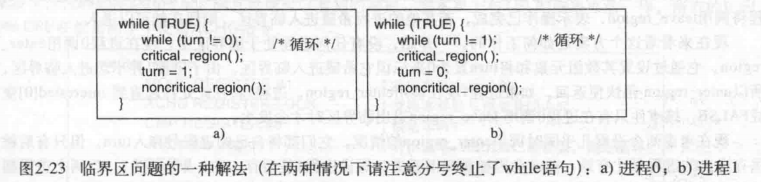 - 整形变量turn,初始值为0,用于记录哪个进程进入临界区,检查或更新共享内存