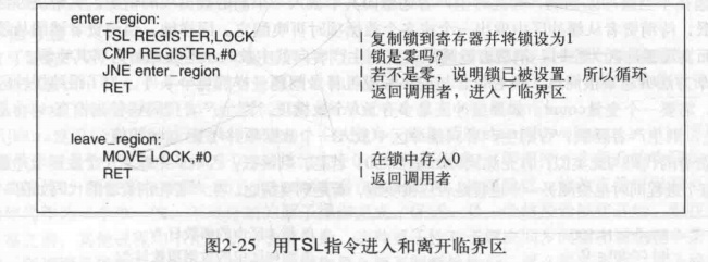 - 一个进程发现锁值为0,恰好将值设置为1之前,另一个进程被调度运行,将锁值变为1,当第一个进程再次运行,同样也将该锁设置为1,此时同时有两个进程进入临界区