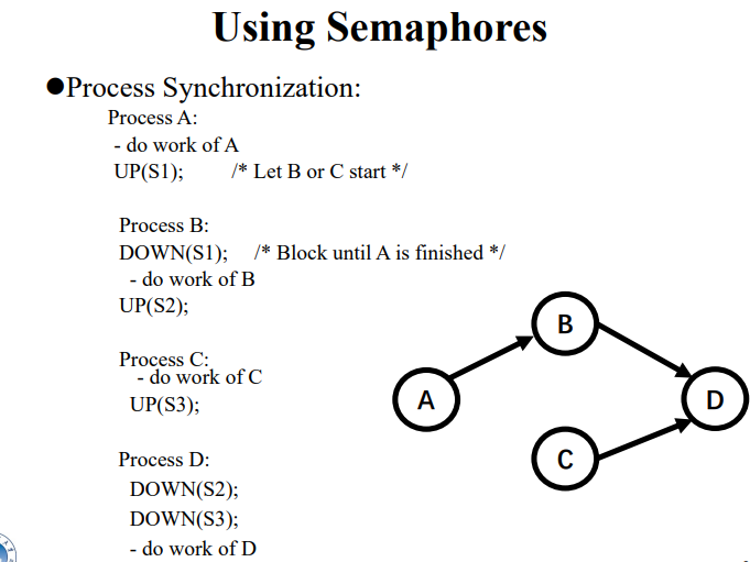 - Busy-Waiting: 执行代码的进程将处于紧密循环中,占用 CPU 周期,一遍又一遍地测试某些条件,直到它变成真的。