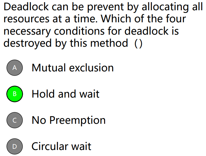 - 涉及可抢占资源的潜在死锁通常可以通过将资源从一个进程重新分配到另一个进程来解决