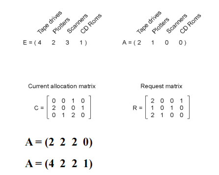 - E是现有资源向量,代表每种已存在的资源总数;A是可用资源向量