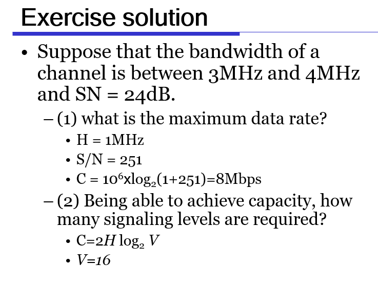 Maximum number of bits/sec: \[ Hlog_2(1+S/N) \]