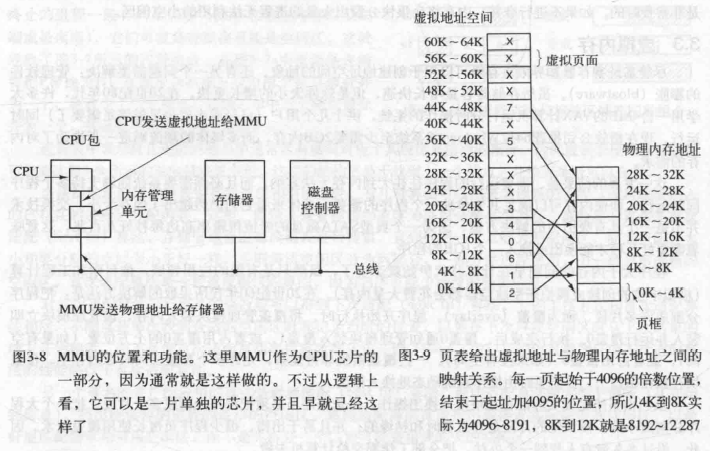 虚拟地址空间(virtual address space)按照固定大小分为(虚拟)页面(pages),物理内存中对应的为页框(page frames),页面和页框大小通常是一样的