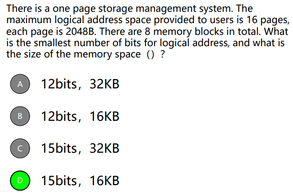 虚拟地址空间总共大小为:\(16 * 2048 = 2^{15}B=32KB\),所以需要至少15位来标记