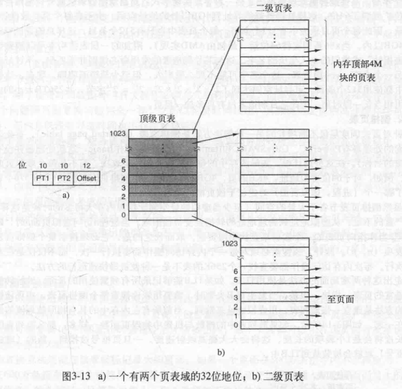 - 顶级页表的表项0指向程序正文的页表,表项1指向数据的页表,表项1023指向堆栈的页表,其他的表项未用