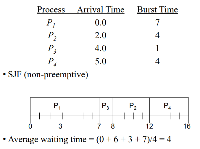 - SJF是最优的–为给定的一组进程提供最小的平均等待时间。
