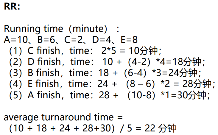 - 分发给每一个进程一个固定的时间片,进行不断地切换