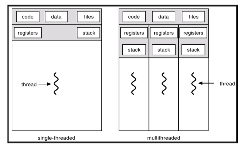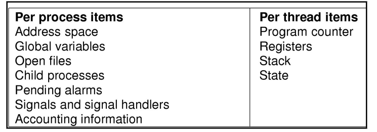 - 线程包含一个线程ID、一个程序计数器、一组寄存器和一个栈